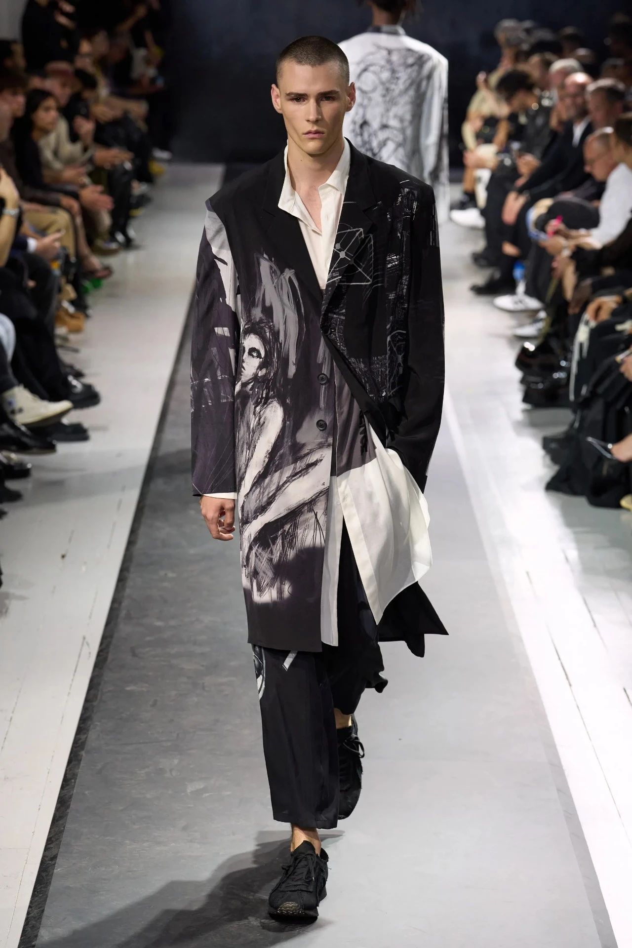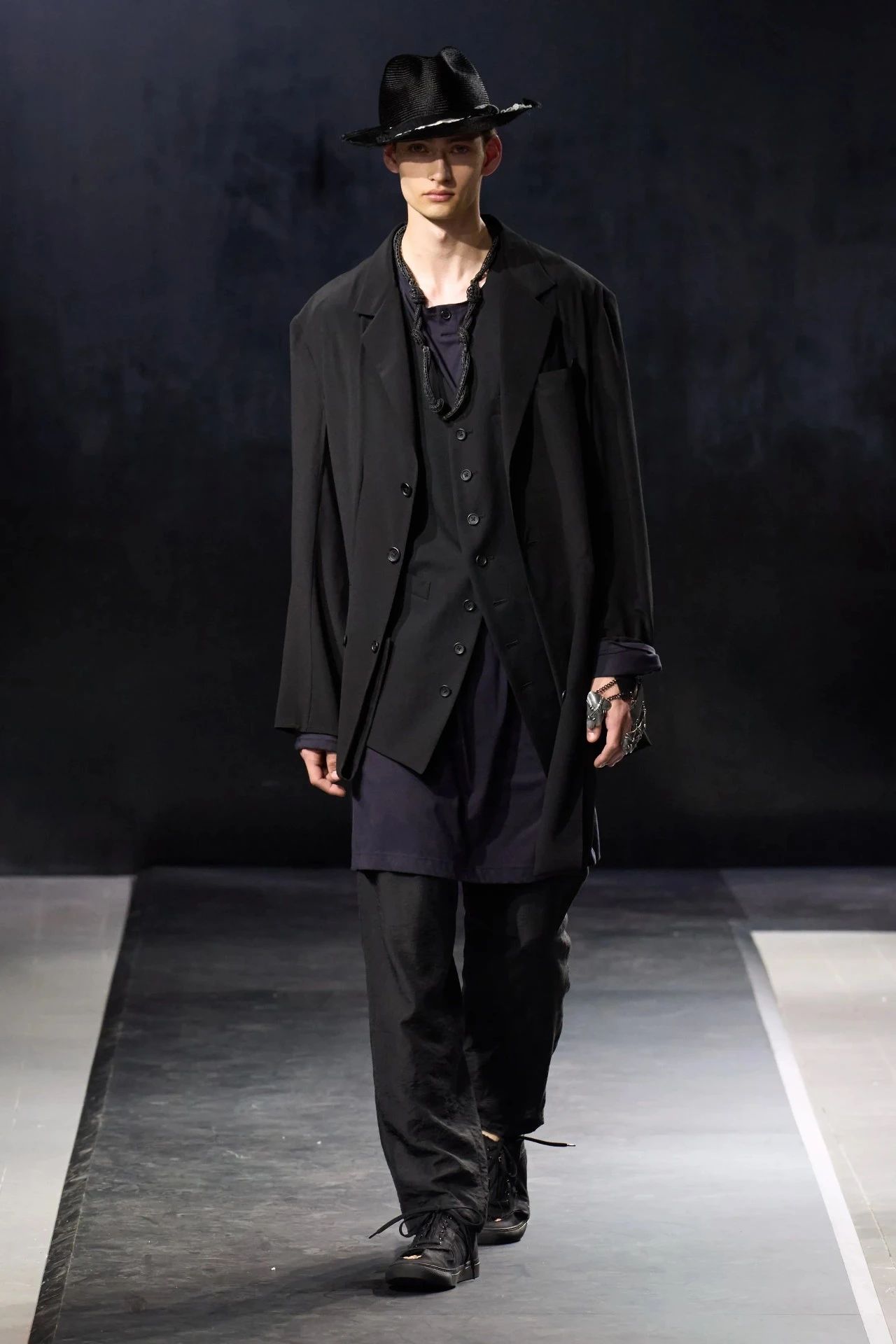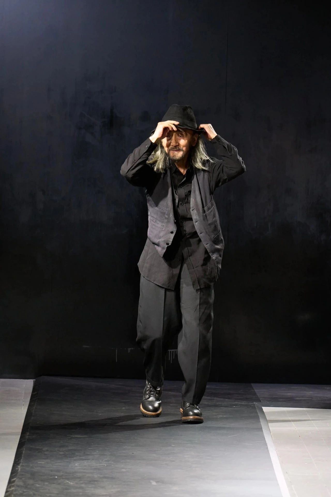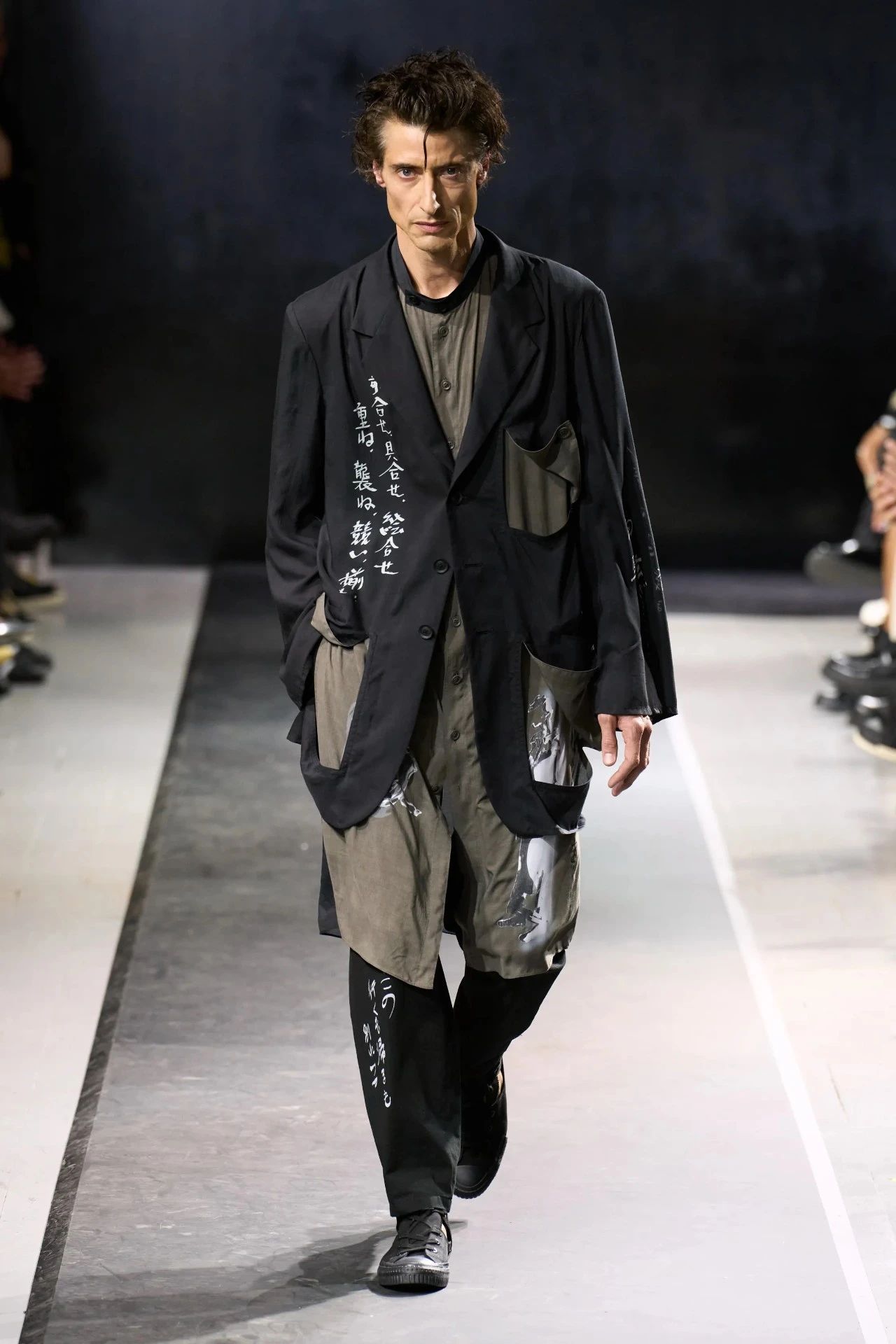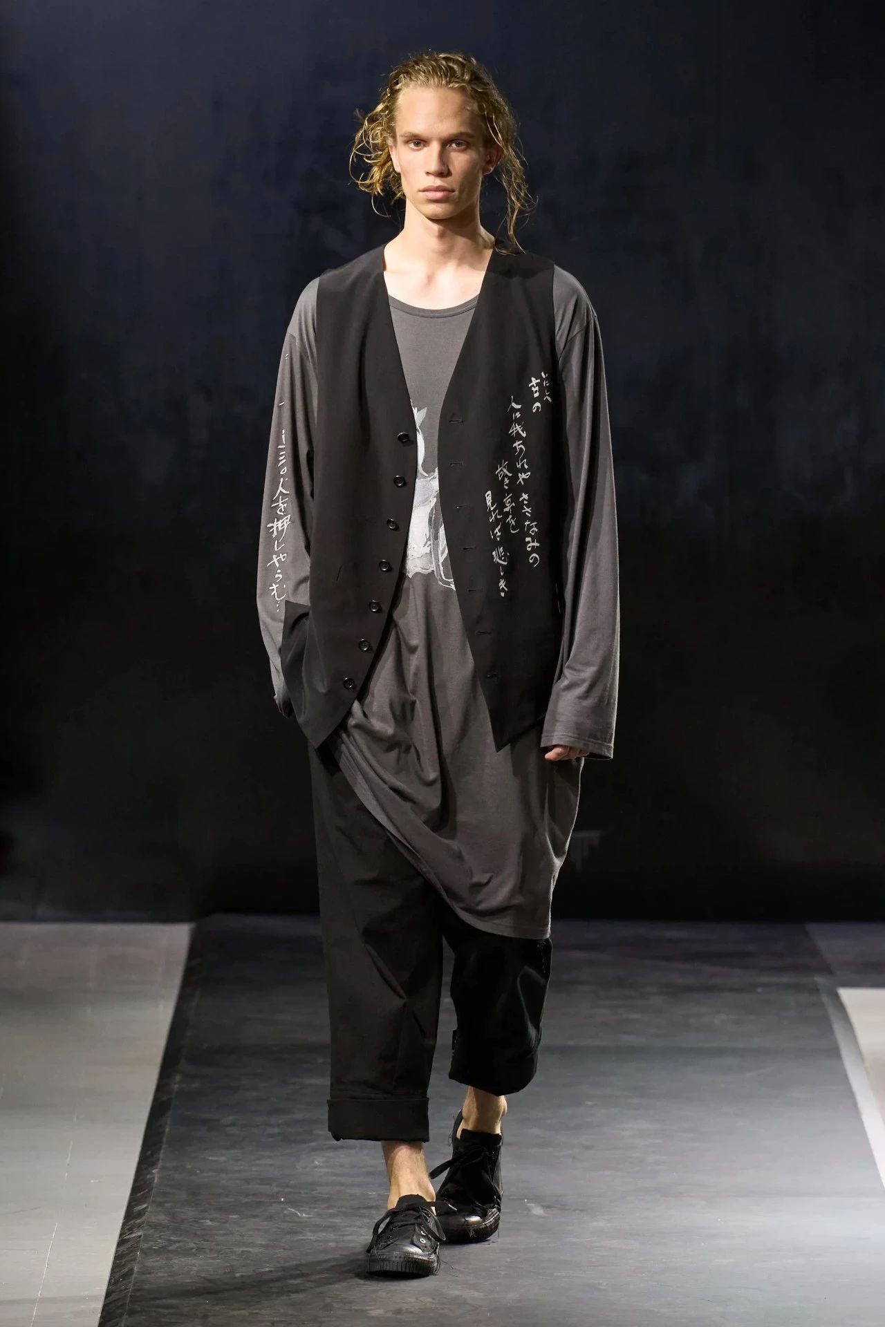 Yohji Yamamoto的2025春夏男装系列,像是一封充满诗意与哲思的书信。这一系列的设计理念不仅仅是关于服装本身,更是一场文化与哲学的深刻对话,展现了设计师对于时间流逝、人生无常以及当下社会状况的反思。