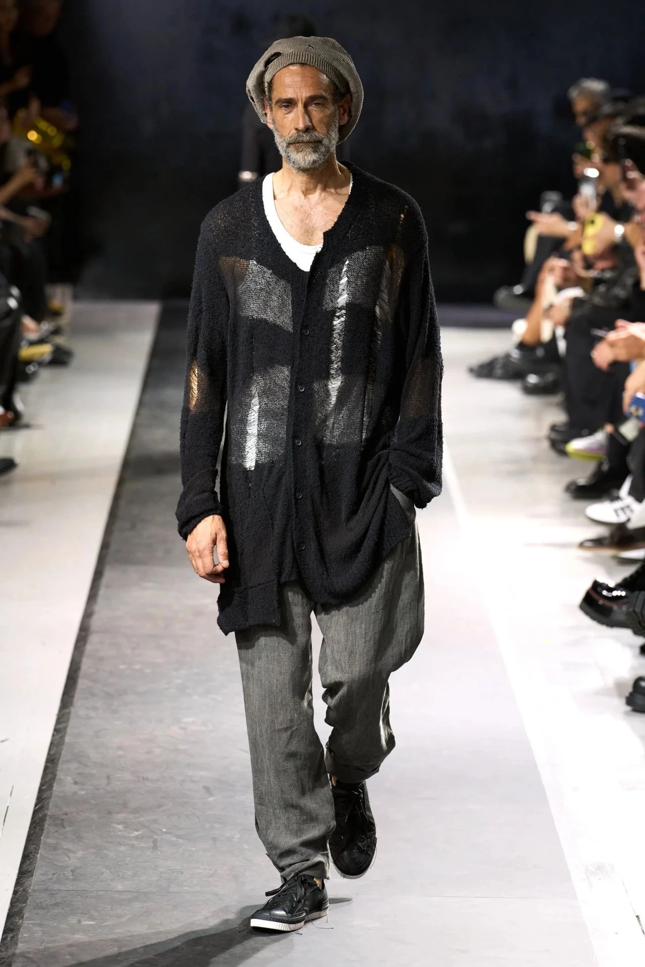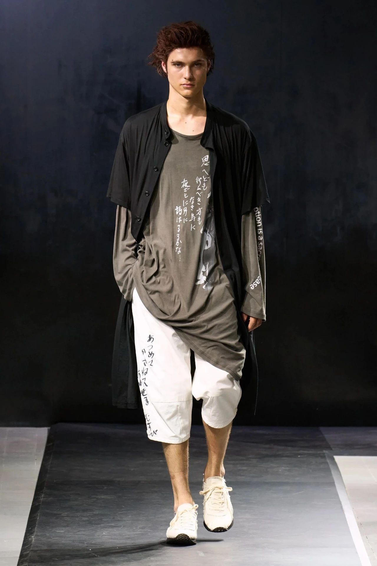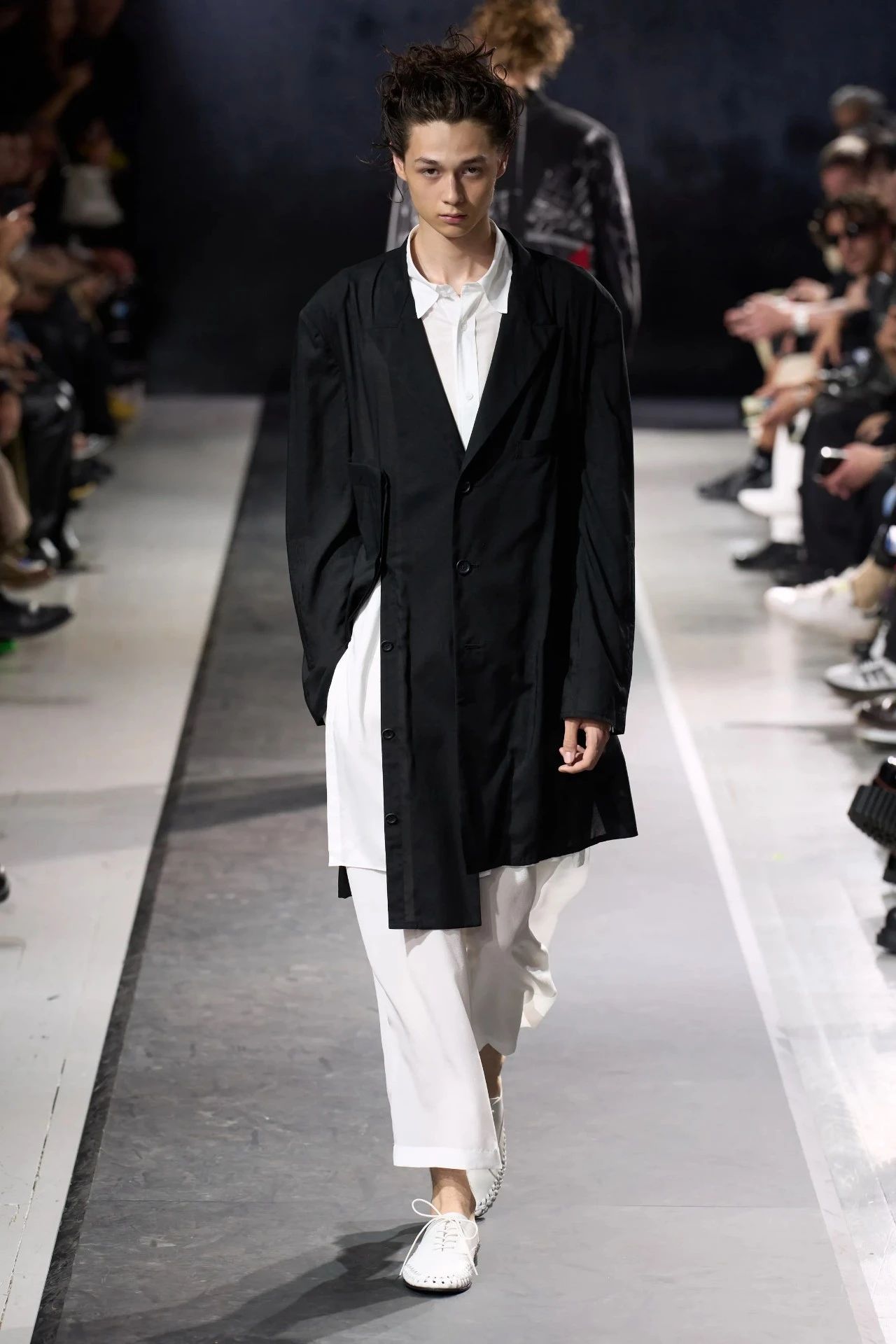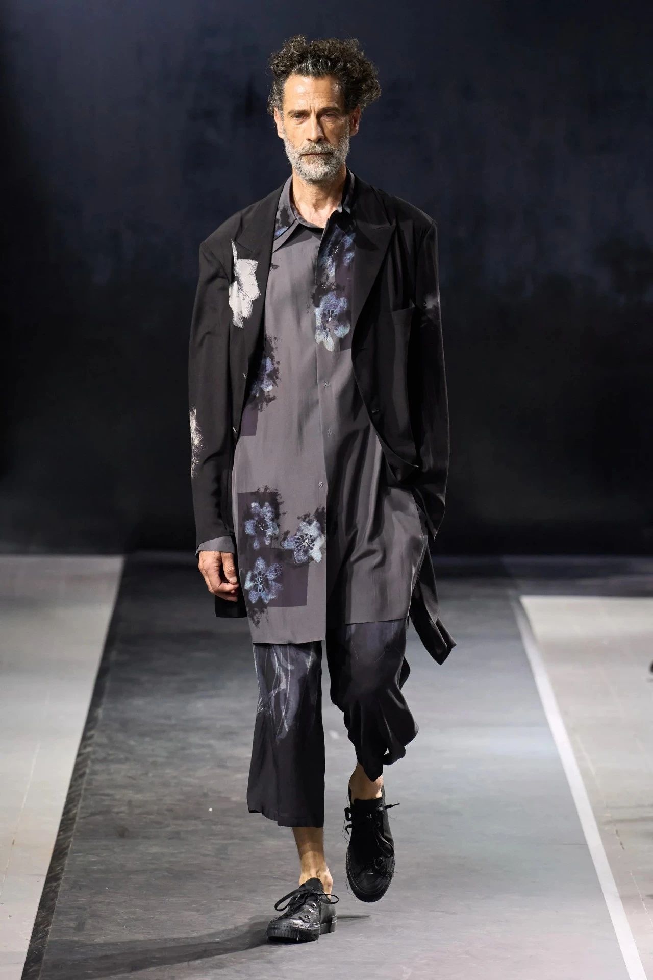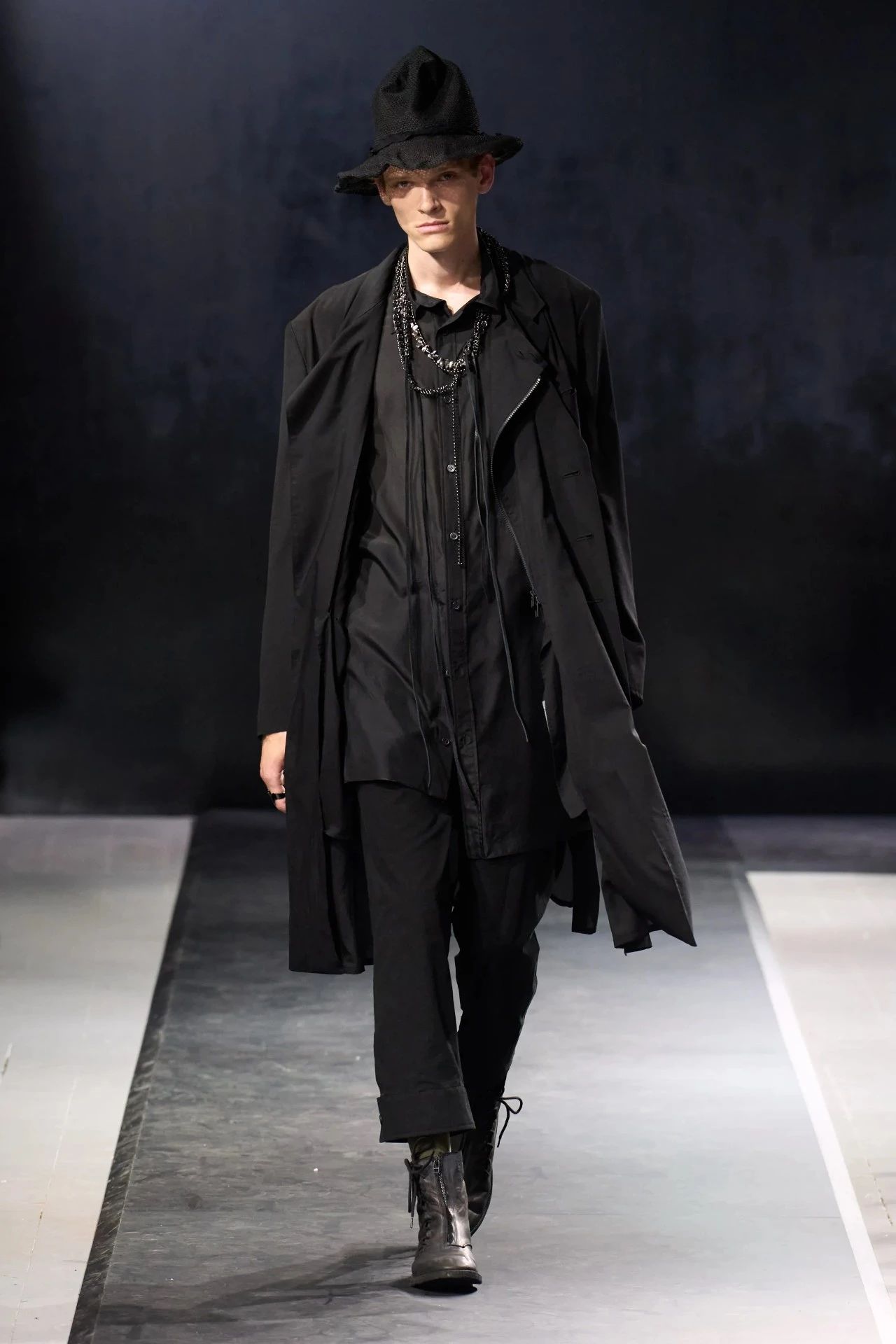Yohji Yamamoto的2025春夏男装系列,像是一封充满诗意与哲思的书信。这一系列的设计理念不仅仅是关于服装本身,更是一场文化与哲学的深刻对话,展现了设计师对于时间流逝、人生无常以及当下社会状况的反思。