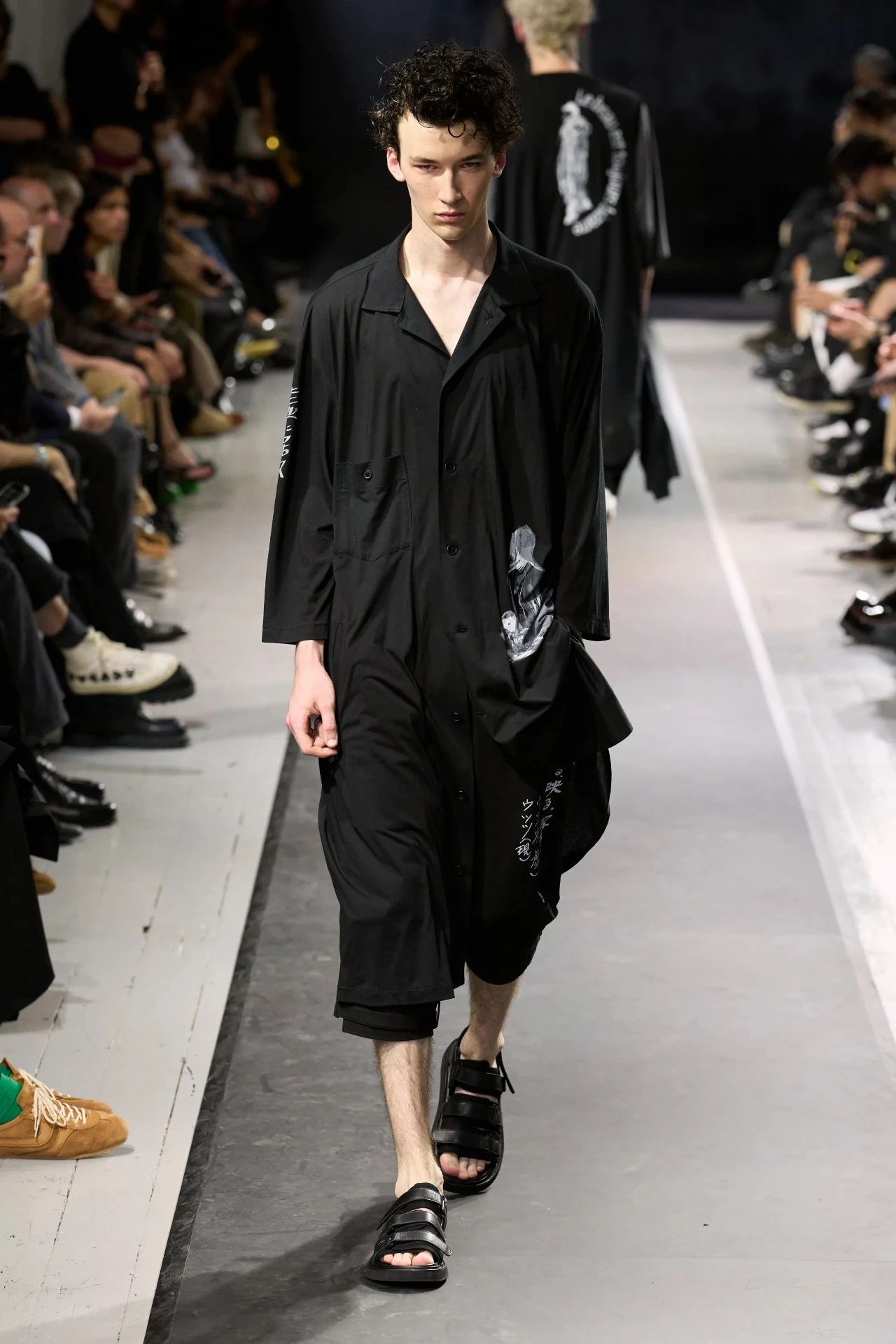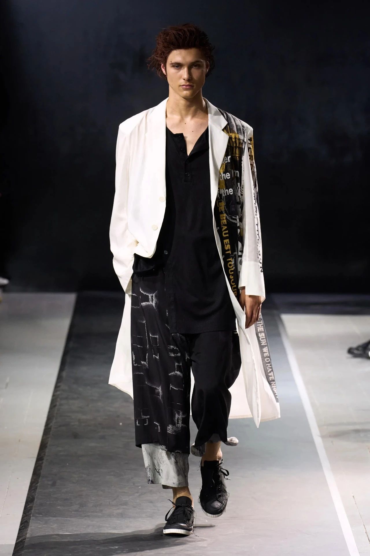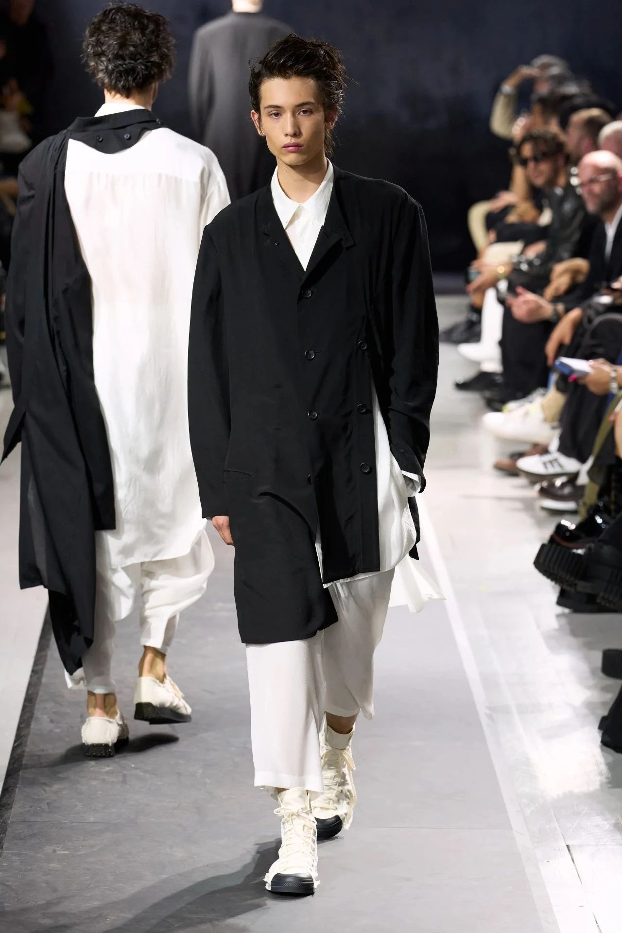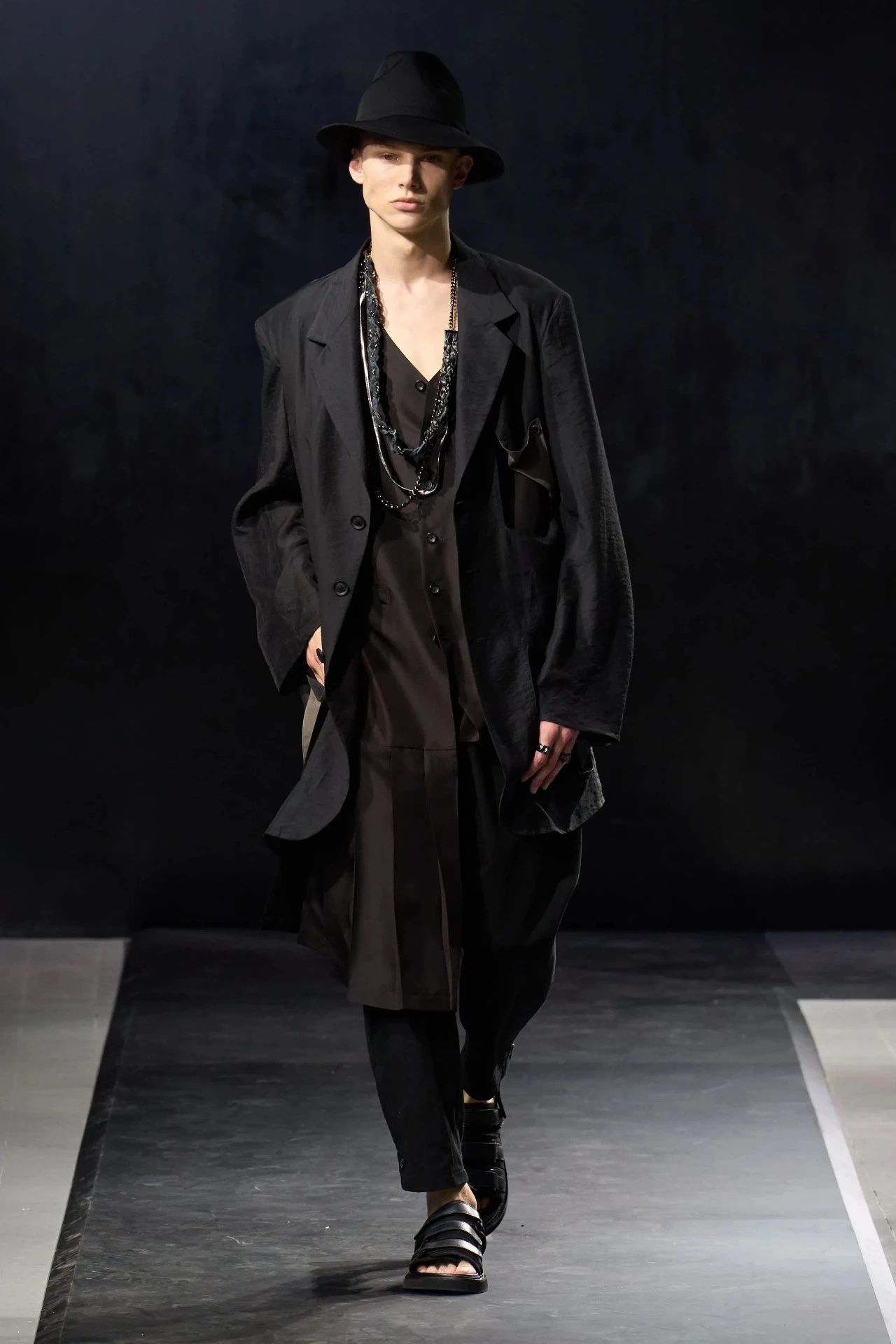 Yohji Yamamoto的2025春夏男装系列,像是一封充满诗意与哲思的书信。这一系列的设计理念不仅仅是关于服装本身,更是一场文化与哲学的深刻对话,展现了设计师对于时间流逝、人生无常以及当下社会状况的反思。