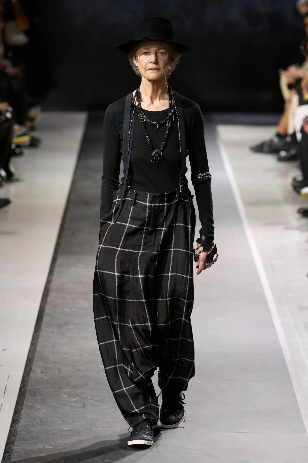 英国女演员Charlotte Rampling作为山本耀司心中的缪斯女神惊喜亮相,她所展示的服装上出现了「一切皆苦」「諸行無常」等佛教用语,这不仅让人联想到Yohji Yamamoto 2002春夏系列秀场上被《心经》包裹的裙衫,也反映了设计师对于当下这个不安又危险的世界的深刻反思。
